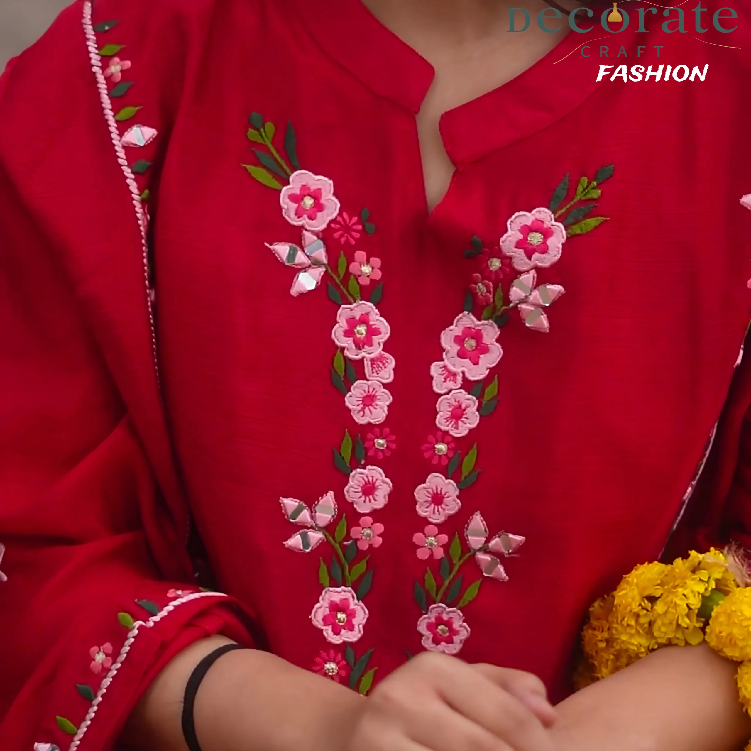 Chic Embroidery: Exquisite floral details on a bold red canvas.